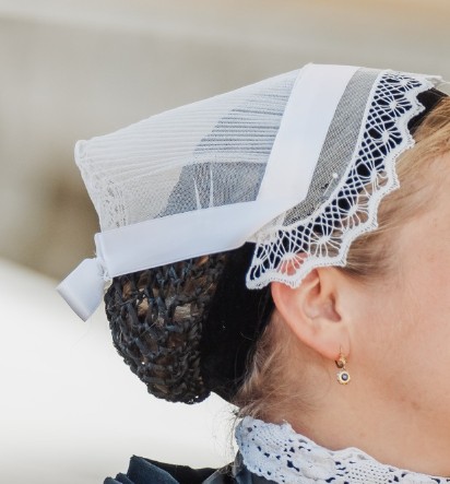 Les cheveux coiffés en chignon serré, sont maintenus par une résille et une tresse de laine sur lesquelles est posée une coiffe, de forme « sabot ».